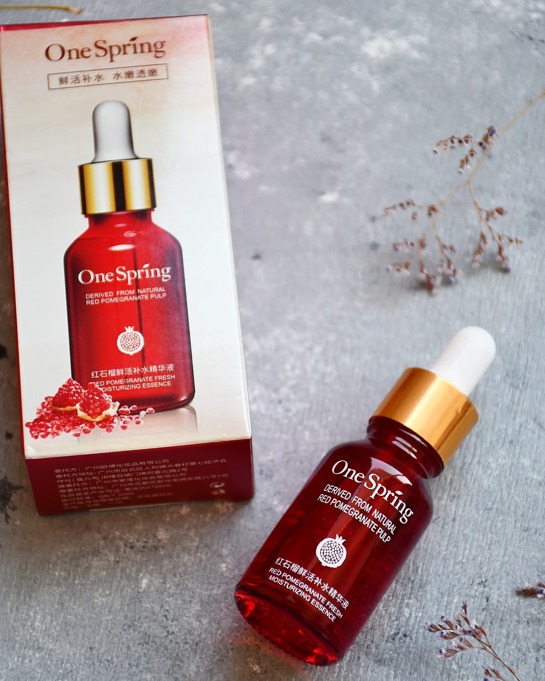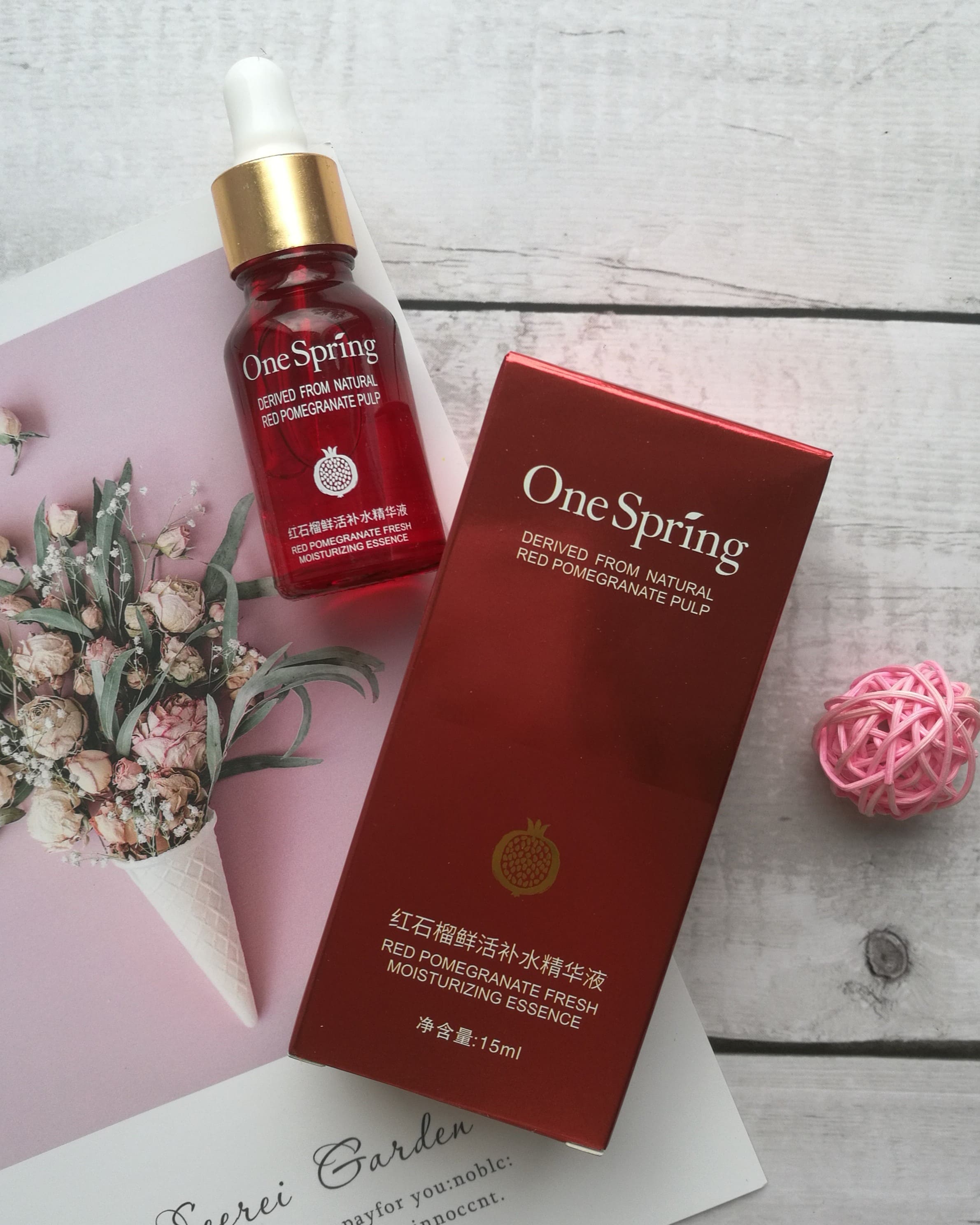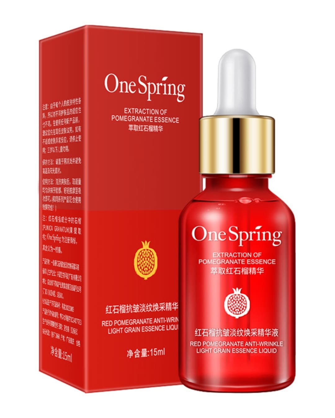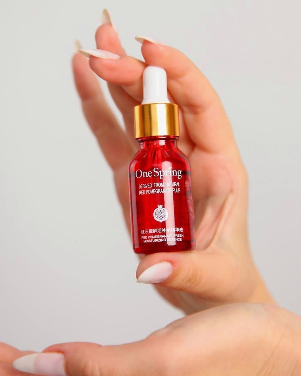 Сыворотка для лица с гранатом (ONE SPRING Extraction Of Pomegranate Essence) направлена на увлажнение, питание, антивозрастной уход и улучшение общего состояния кожи. Она защищает кожу от вредного воздействия окружающей среды, стимулирует выработку коллагена, повышая упругость и эластичность кожи, улучшает микроциркуляцию и ускоряет обновление клеток, осветляет пигментацию, веснушки и пост-акне, выравнивает цвет лица, активизирует естественную защиту кожи от факторов старения.